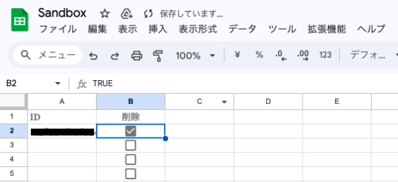 A列にsampleチャンネルのIDを記載しておき、B列の「削除」にチェックを入れたことをトリガーとしてチャンネルを削除する想定で進めていきます。