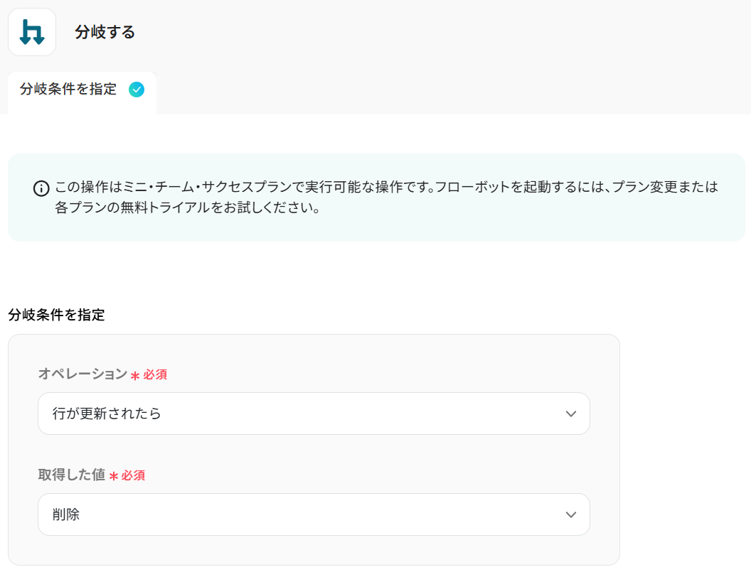 ※「分岐する」オペレーションは、ミニプラン 以上でご利用いただけます。フリープラン で利用するとエラーになってしまうのでご注意ください。 ミニプランなどの有料プランは2週間の無料トライアルが可能です。無料トライアル中なら、普段制限されているアプリや機能も自由にお試しいただけますので、ぜひ活用してみましょう!