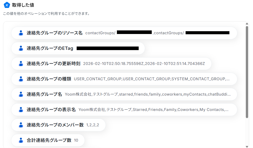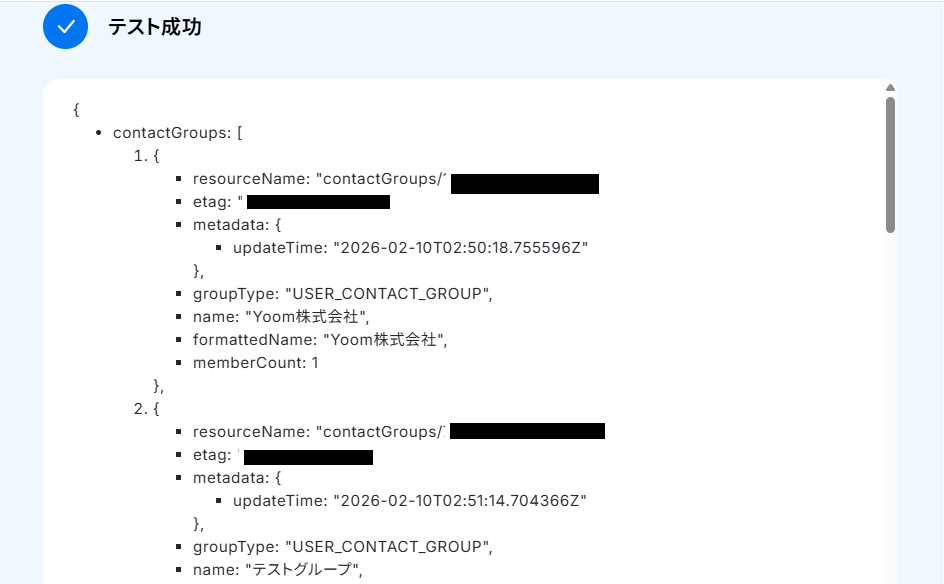 テストが成功すると、Googleコンタクトの連絡先グループ一覧の情報が取得した値に反映されるので、確認し「完了」ボタンを押してください。