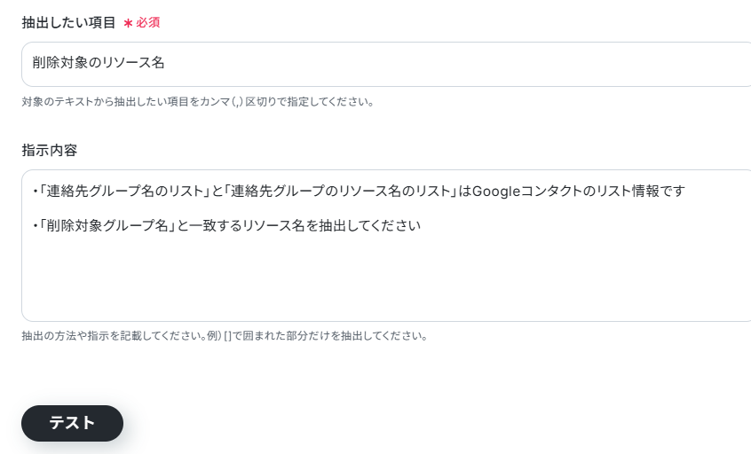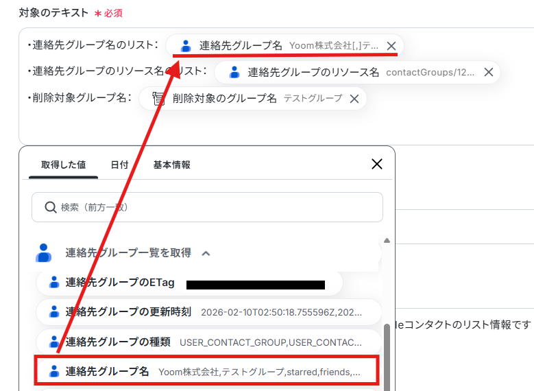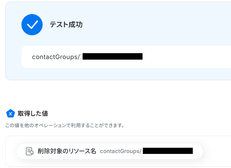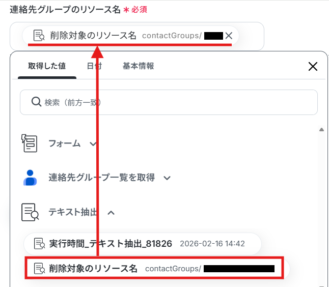連絡先グループのリソース名は、先ほどテキスト抽出した「削除対象のリソース名」が自動で反映されるように設定されているので確認しましょう。