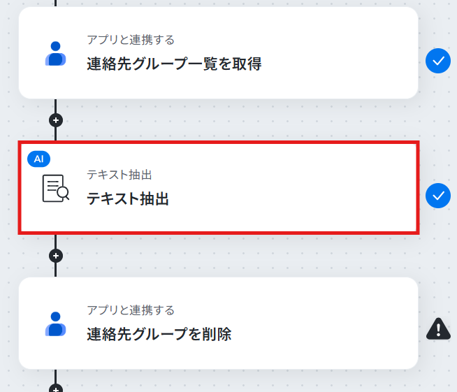 - AI機能によるテキスト抽出では、前段で取得した連絡先グループ一覧を変数として利用し、抽出したい項目を任意で指定できます。