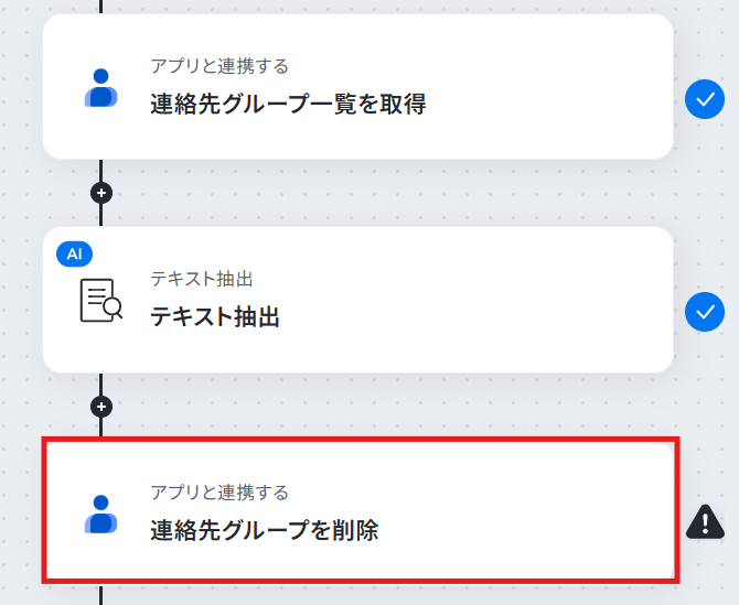 - 最後に、オペレーションでGoogleコンタクトの「連絡先グループを削除する」アクションを設定し、AI機能で抽出した情報を指定します。