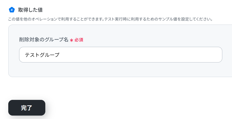 事前準備でテスト用に作成したグループ名を記載してください。
