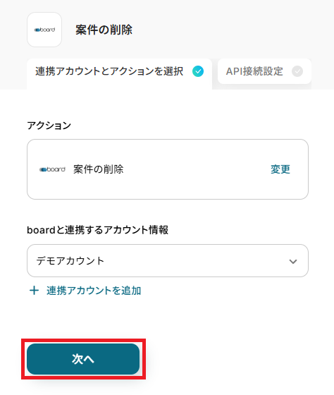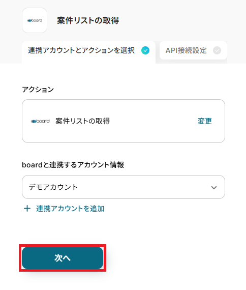再度、boardと連携するアカウントに間違いがないかを確認し「次へ」をクリックしましょう