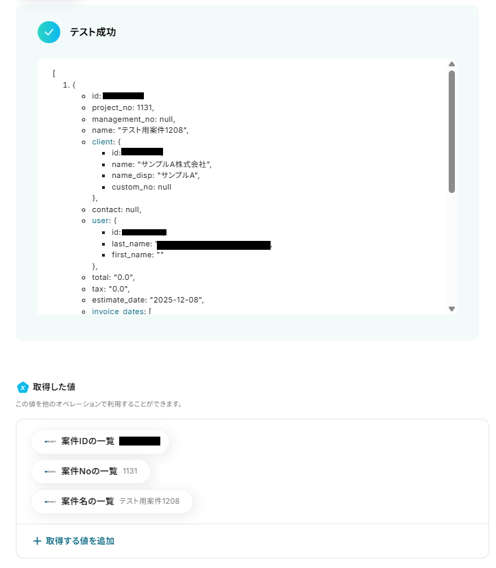 テストが成功すると、該当の案件一覧が取得した値が表示されます。