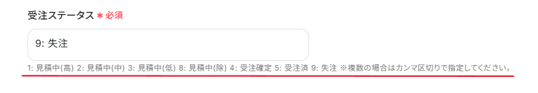 「受注ステータス」は、今回失注案件を取得したので【9: 失注】を入力しました。