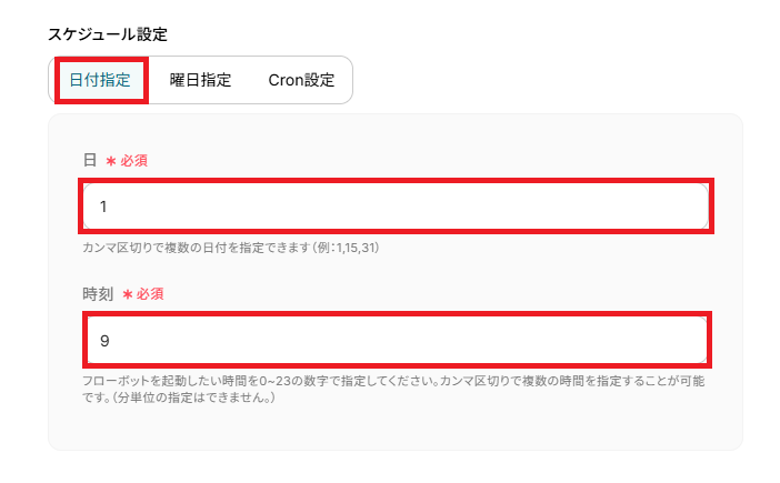 より詳しい設定方法は「スケジュールトリガーの設定方法」も併せてご確認ください。