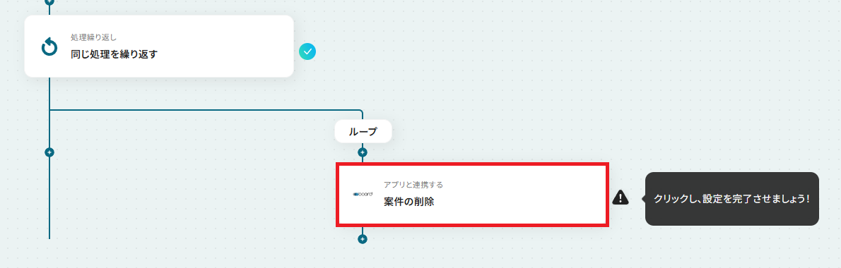 - 最後に、「繰り返し処理」の中でboardの「案件の削除」アクションを設定し、対象の案件を削除します