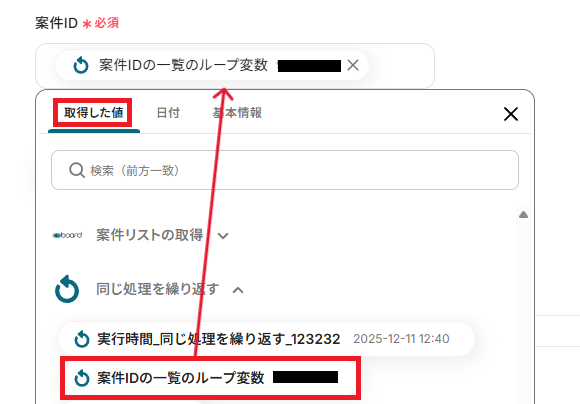 「案件ID」は、取得した値から【ループ変数】を引用しましょう。