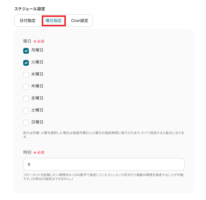日付指定以外にも、曜日指定やCron設定を使用して自由に設定することができます。