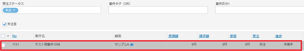 案件リストを取得する際、作成日時も指定できるので「失注」かつ「作成日から1年以上」といった条件も指定できます。