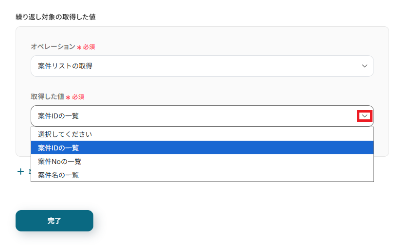 「取得した値」には、ループ処理で用いる項目(案件IDの一覧)を設定しましょう。