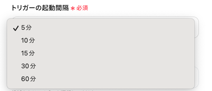 - トリガーは5分、10分、15分、30分、60分の間隔で起動間隔を選択できます。