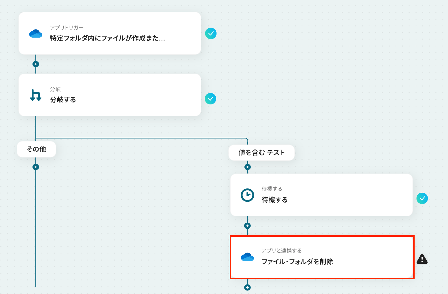 - 分岐機能では、ファイル名や種類といったトリガーで取得した情報を利用し、削除対象とするファイルの条件を任意にカスタマイズできます。