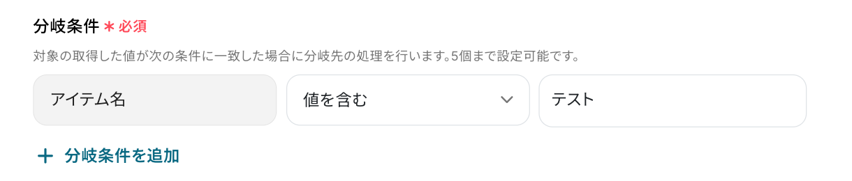 今回は、「アイテム名」に「テスト」という値を含む場合に、次のオペレーションへ進むように設定しました。
