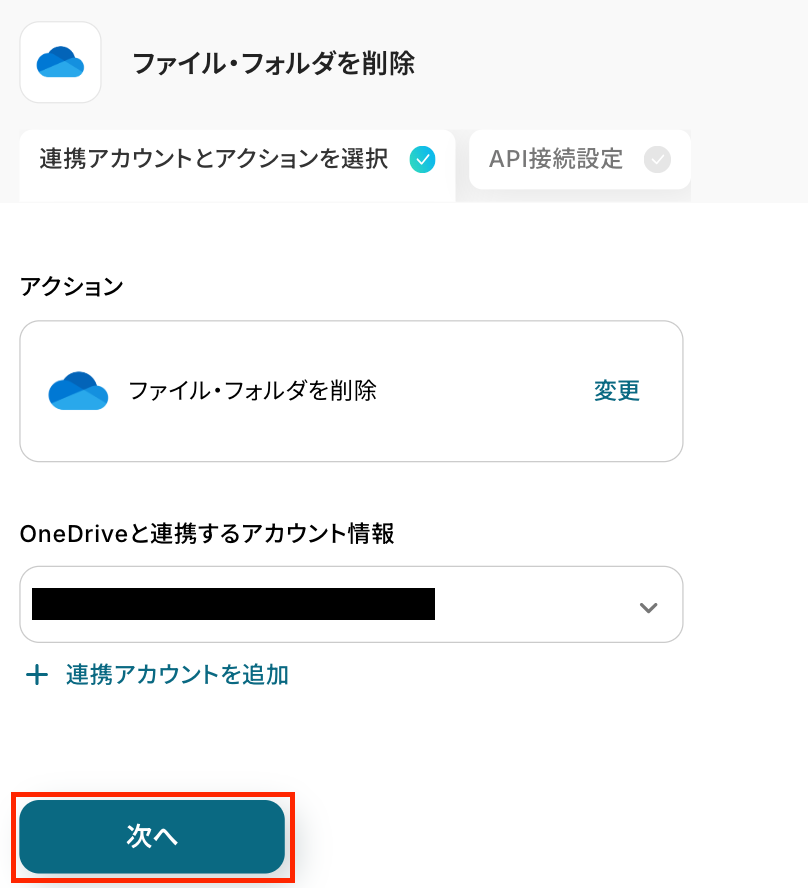 連携するアカウント情報を確認し、アクションはテンプレート通りのまま「次へ」をクリックして進んでください。