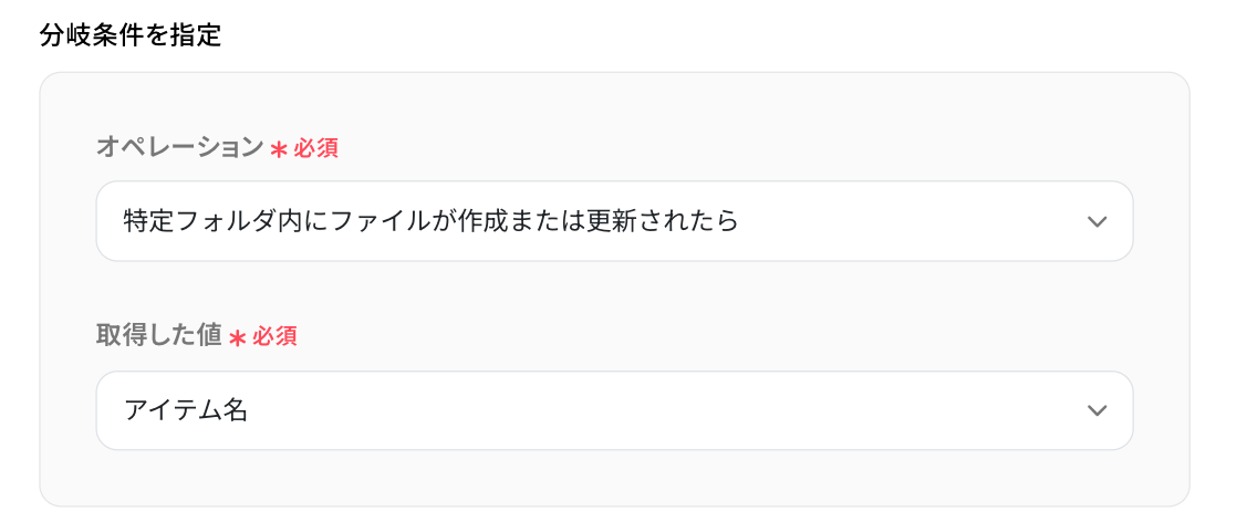 - 次に、オペレーションで分岐機能を設定し、ファイル名などの条件を指定して、特定のファイルの場合のみ後続の処理に進むようにします。