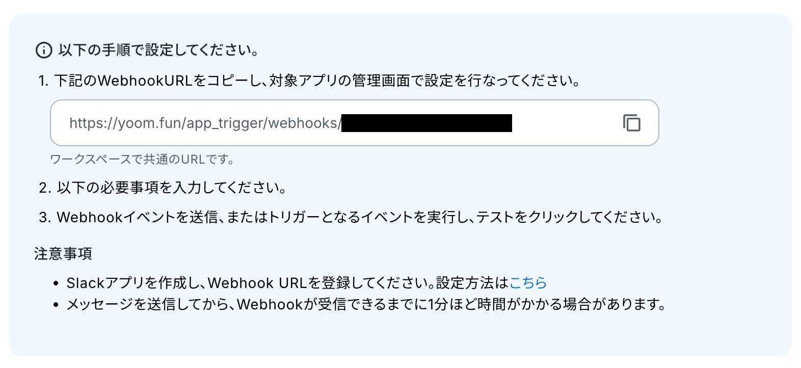 表示された手順にて、SlackにYoomの情報を登録してください。