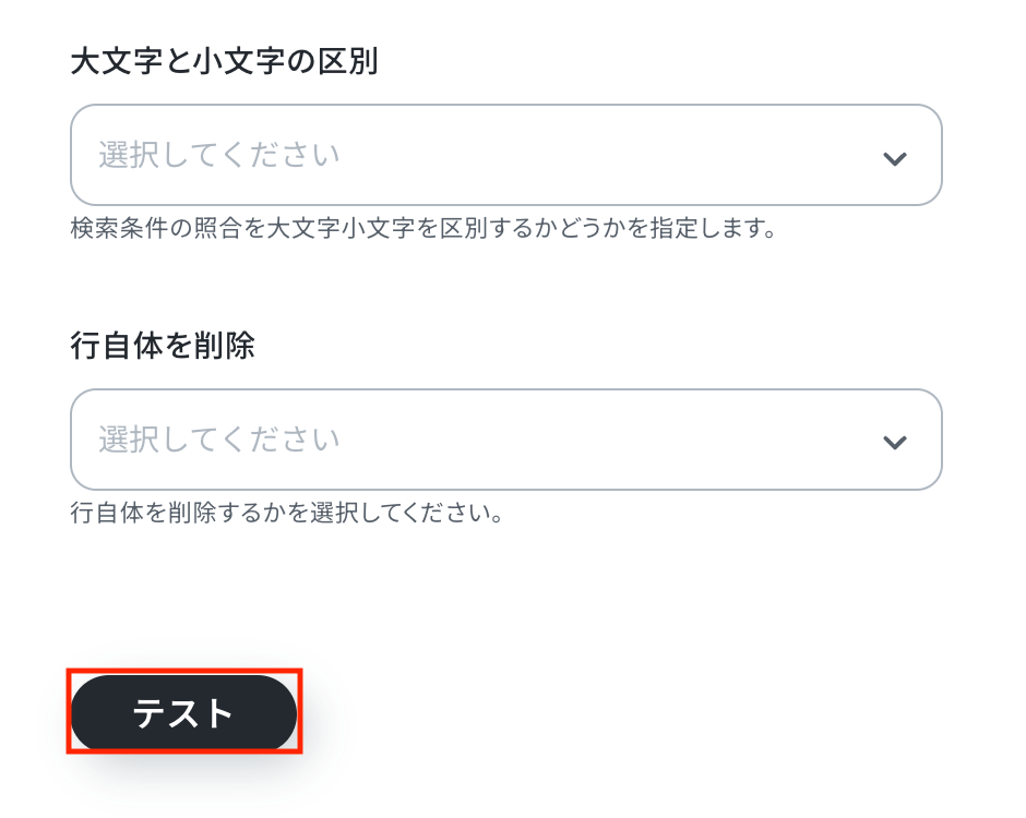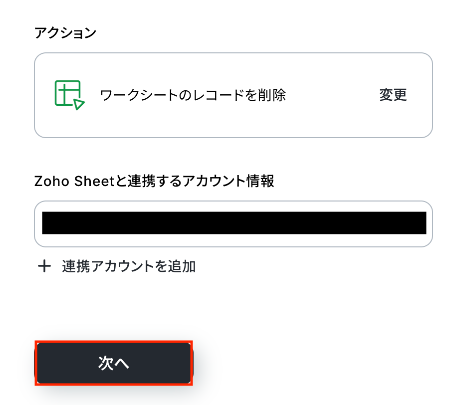 - Zoho Sheetでレコードを削除するアクションでは、対象のワークブックIDとワークシート名を任意で設定してください。