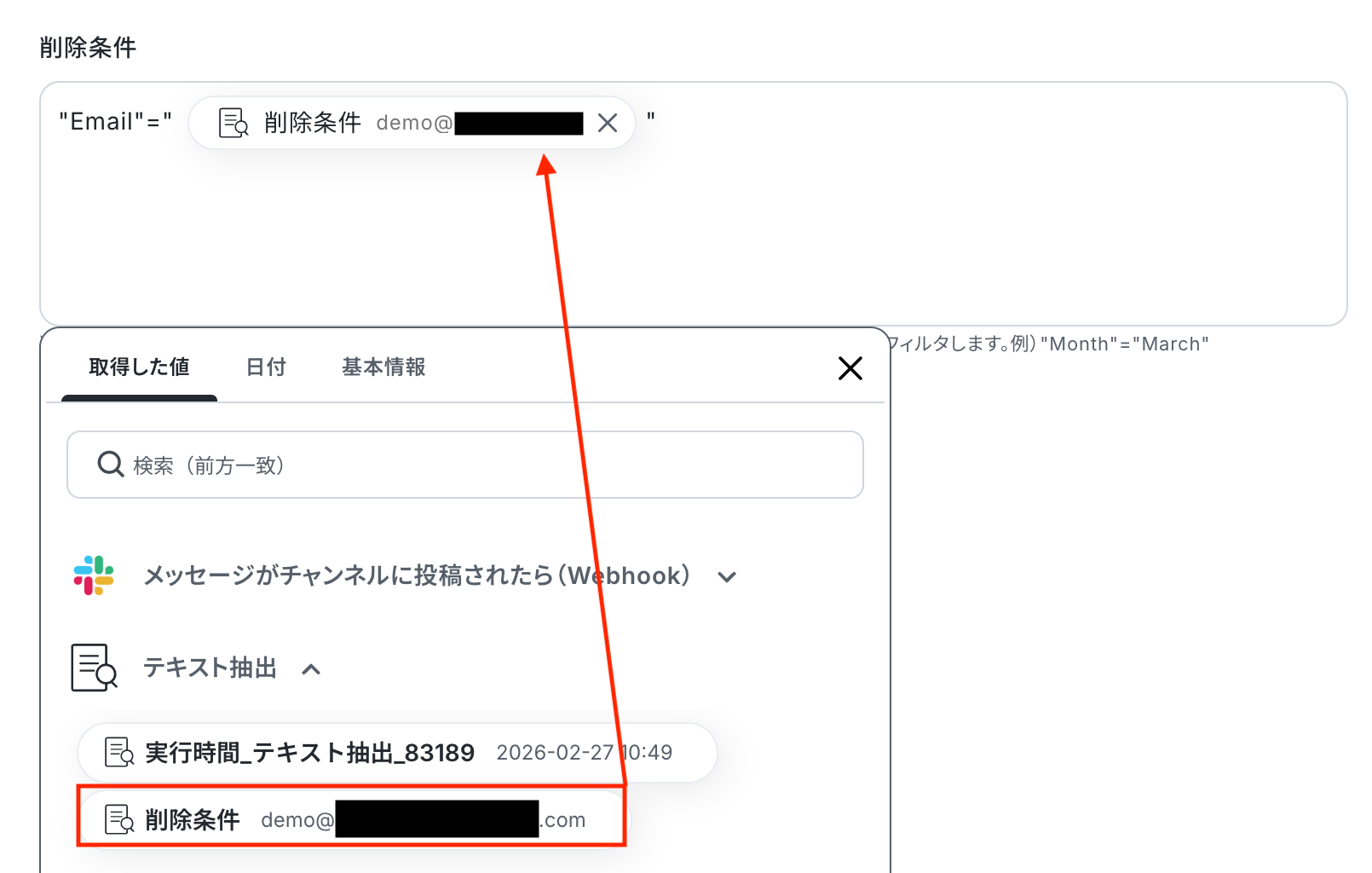 続いて、トリガーのステップでSlackから取得した値を利用して、後続のステップで必要なテキストを抽出する設定を行いましょう。