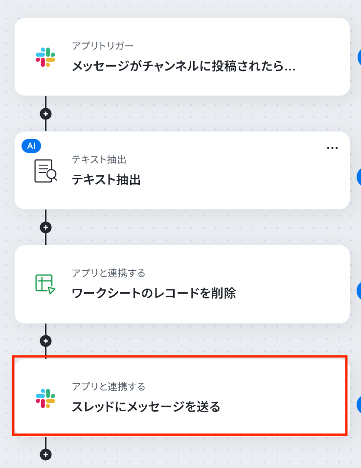 - 最後に、オペレーションでSlackの「スレッドにメッセージを送る」アクションを設定し、処理が完了したことを元の投稿に返信する形で通知します。