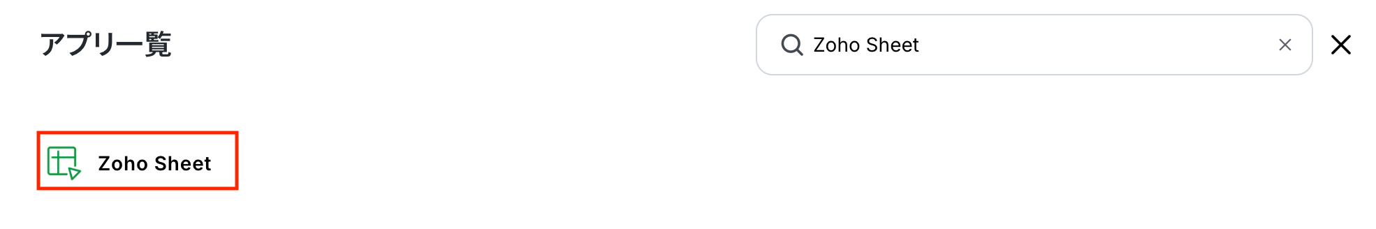新規接続をクリックしたあと、アプリのメニュー一覧が表示されるのでZoho Sheetと検索し、対象アプリをクリックしてください。