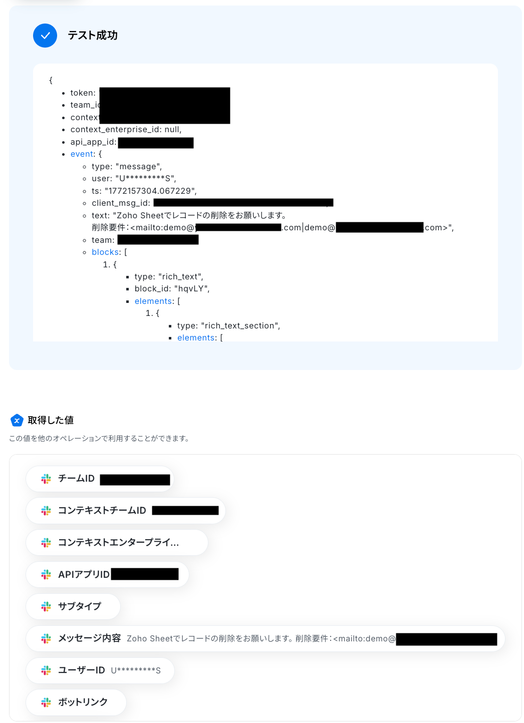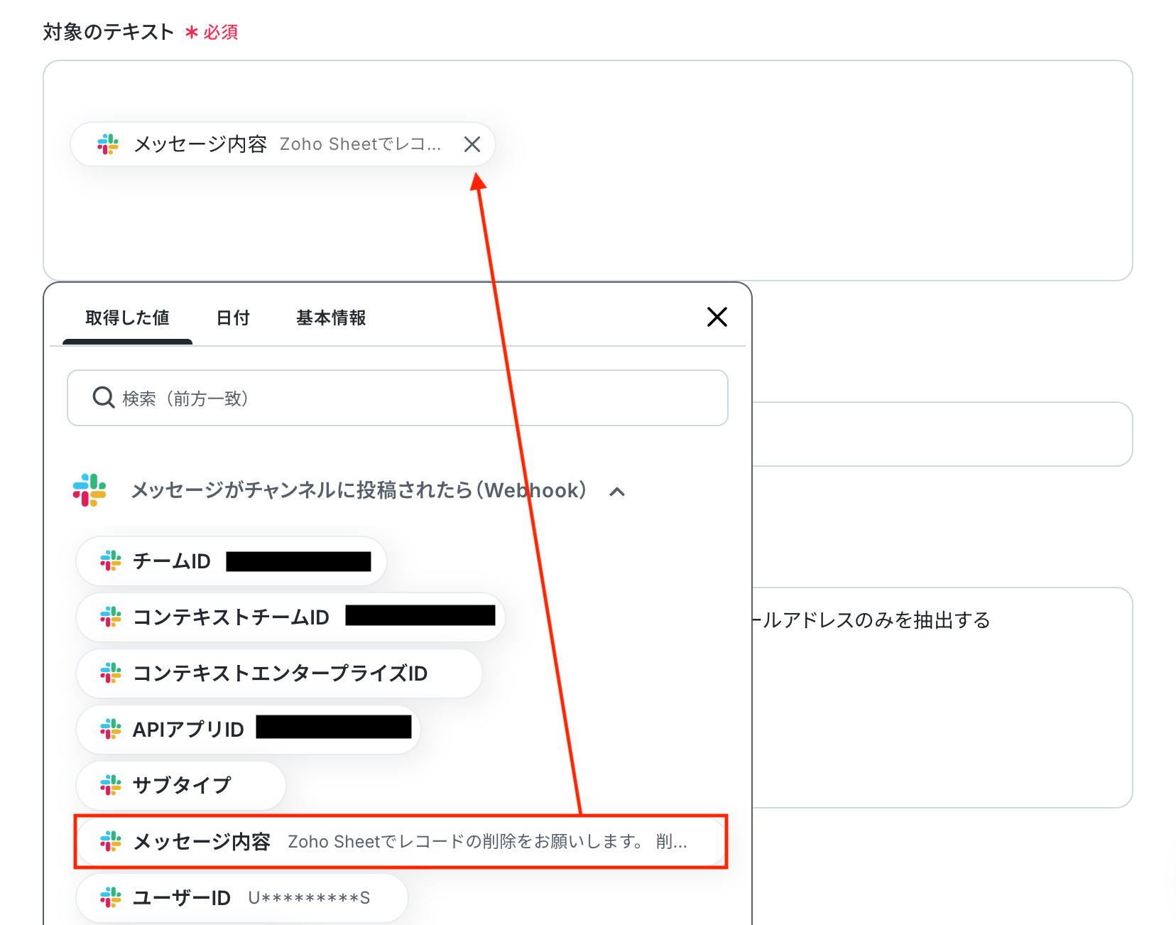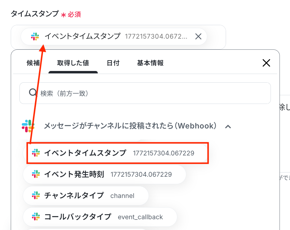 入力欄をクリックすると、前のステップでSlackから取得した値が表示されるので、選択して入力しましょう。