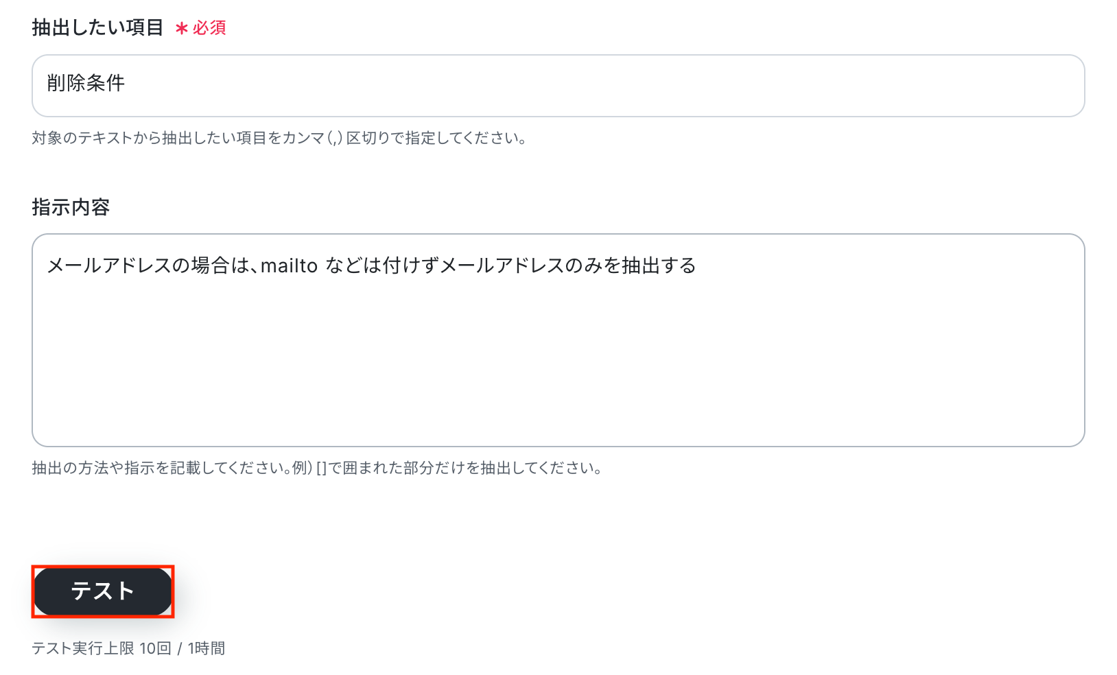 - AI機能のテキスト抽出では、Slackのメッセージから削除対象のレコードを特定するための情報を、どのように抽出するかを任意で設定します。