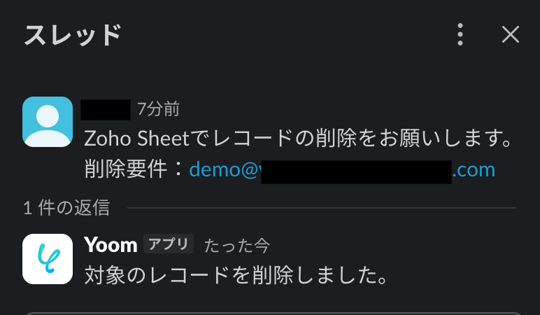 トリガーをONにすることで、Slackで特定のメッセージを受信したタイミングで、その内容をもとにZoho Sheetの該当レコードが自動で削除され、削除完了の通知がSlackに送信されるようになります。