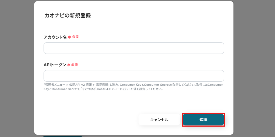 カオナビを検索すると下記画面が表示されます。アカウント名とAPIトークンをそれぞれ入力し「追加」ボタンを押してください。