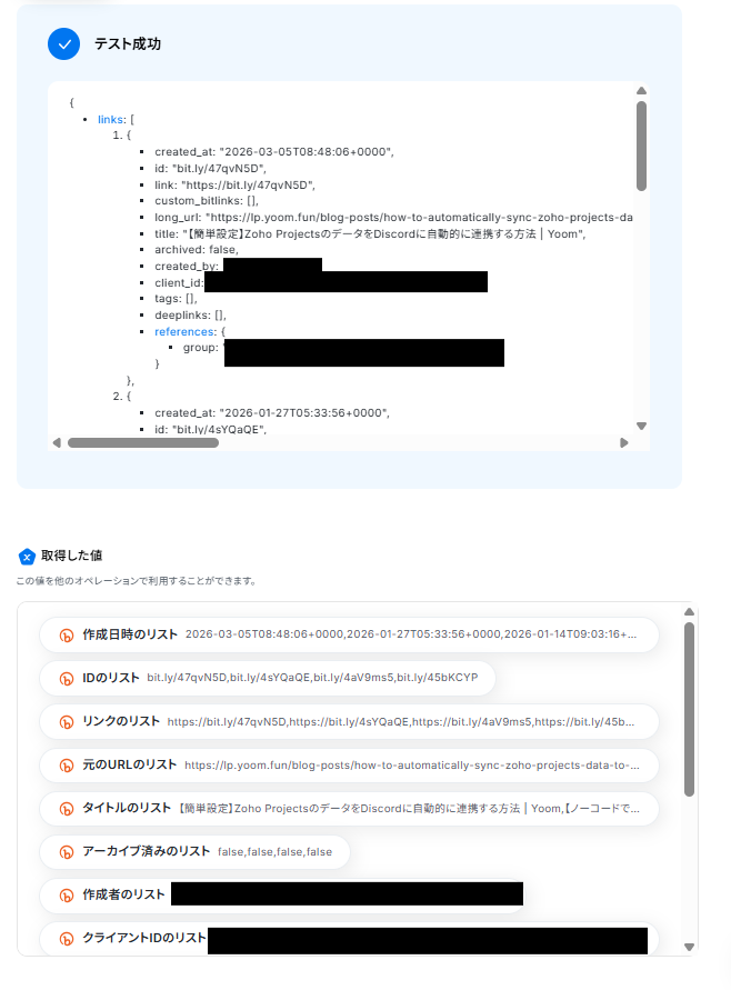 - Bitlyの検索や削除アクションでは、固定値だけでなく、前のステップで取得した情報を変数として利用し、処理対象を動的に設定することが可能です。