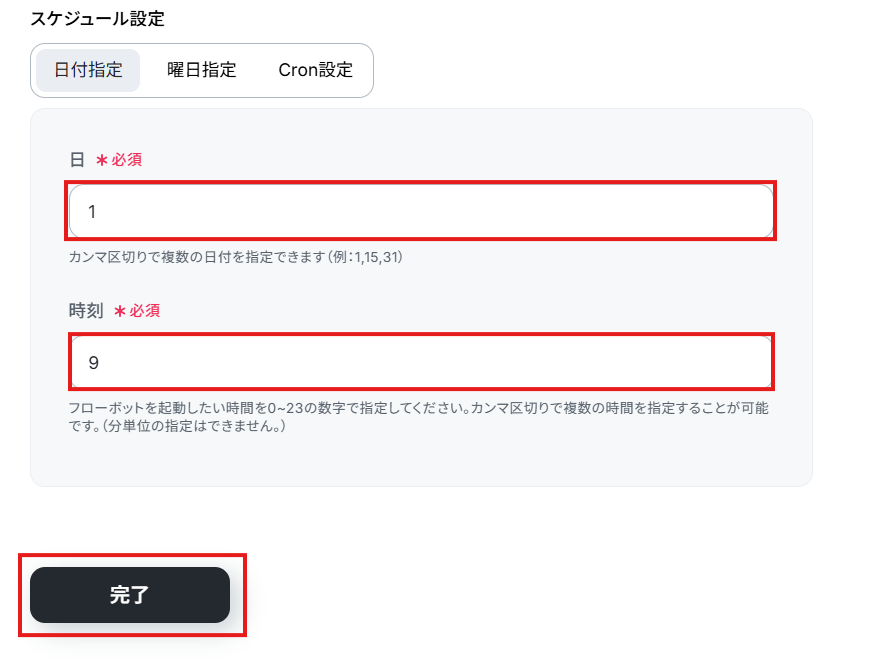 今回は例として1日の9時に起動するように設定しました!