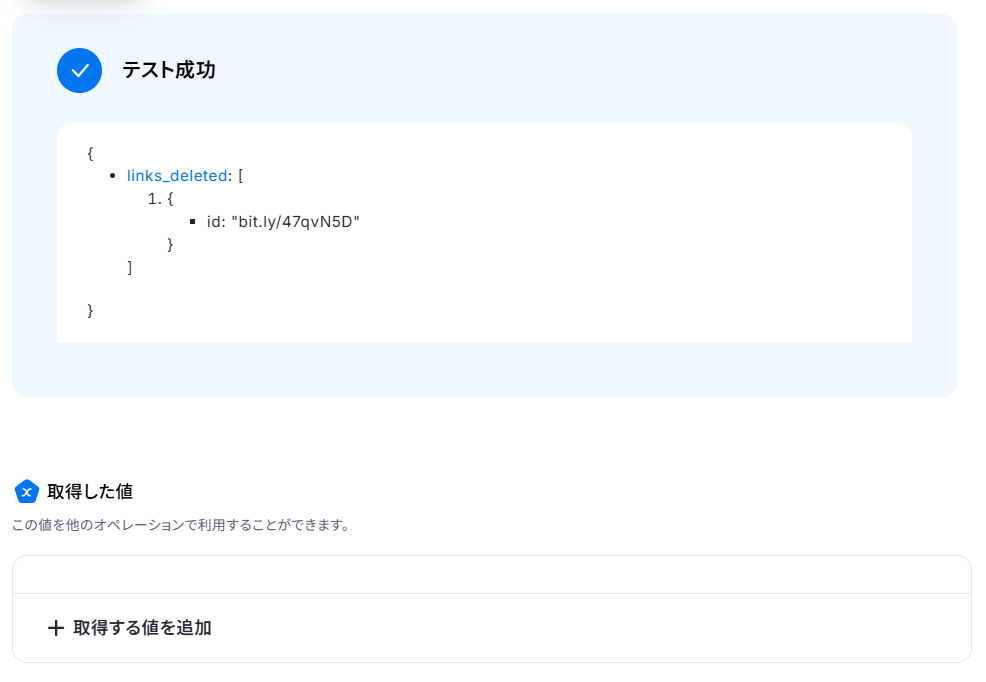 - 最後に、条件に合致したリンクのみ、Bitlyの「Bitlinkを削除」アクションで削除処理を実行します。