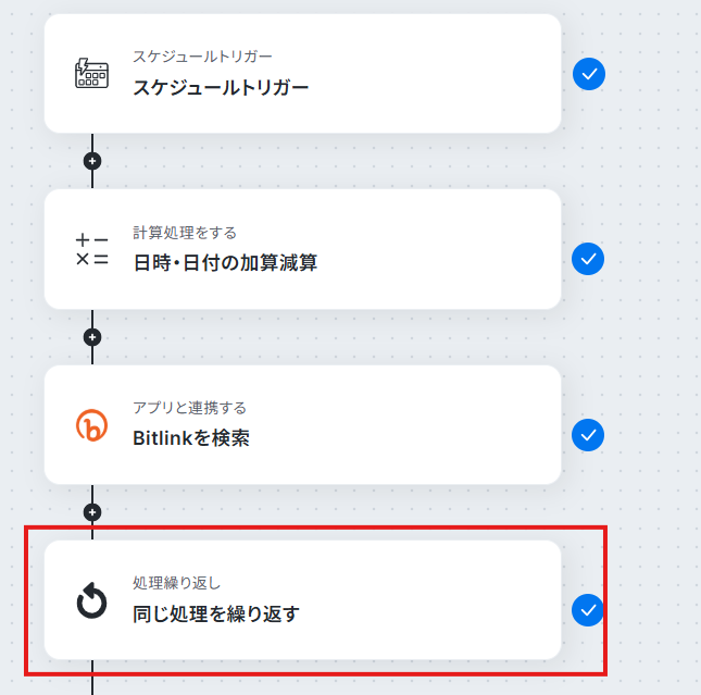 - 繰り返し処理機能を設定し、取得した複数のリンク情報に対して、後続の処理を一つずつ実行するようにします。
