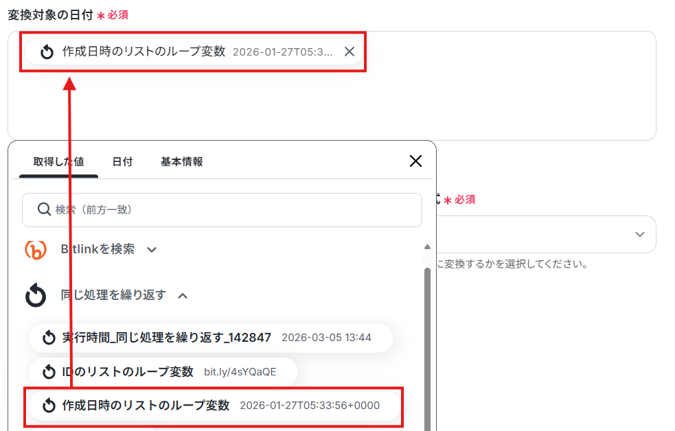 変換対象の日付に取得した値から作成日時のリストのループ変数を設定しましょう。