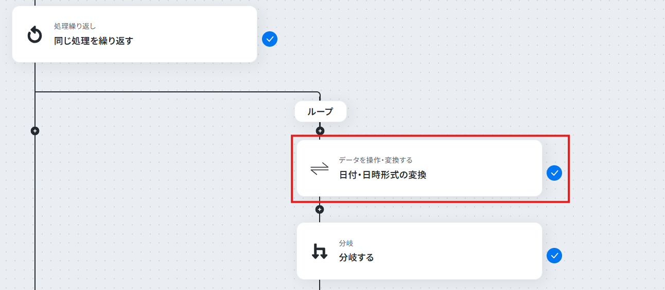 - 「同じ処理を繰り返す」オペレーション間の操作は、チームプラン・サクセスプランでのみご利用いただける機能となっております。フリープラン・ミニプランの場合は設定しているフローボットのオペレーションやデータコネクトはエラーとなりますので、ご注意ください。