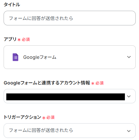2.画面が遷移するので、連携アカウントとアクションを設定しましょう。 タイトルとアカウント情報はステップ1で設定した内容が入力されています。 トリガーアクションは、テンプレート通りに「フォームに回答が送信されたら」のままで大丈夫です。 「次へ」をクリックして進んでください。