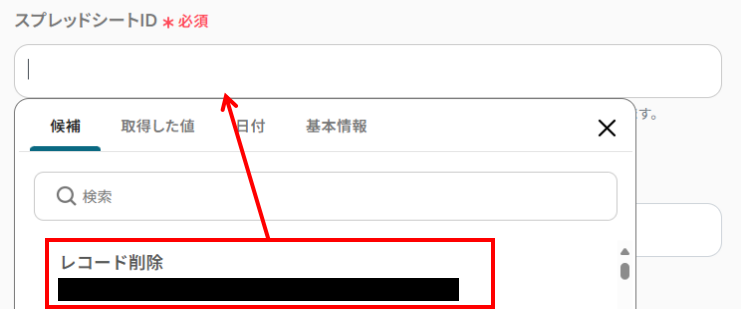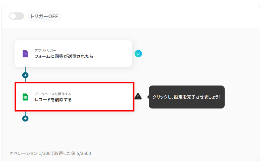 1.次は、Google スプレッドシートから削除するレコードについて設定します。 まずは、以下の赤枠をクリックしてください。