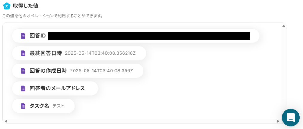入力が完了したら、「テスト」を実行してください。 テストが成功すると下記のようなアウトプットが表示されます。 Googleフォームで回答した内容が反映していればOKです! ※Googleフォームをトリガーに設定した場合の回答データの取得方法については、こちら を参考にしてみてくださいね。 最後に、「保存する」を押して次のステップへ進みましょう。