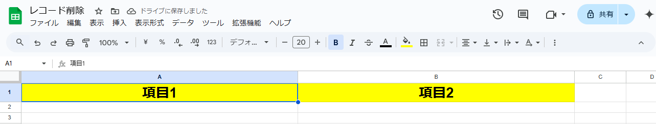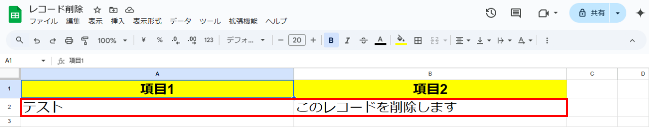 2.ここでは、レコードを削除するGoogle スプレッドシートを具体的に設定していきます。 まだ、Google スプレッドシートを作成していない場合はこのタイミングで作成してください。 今回は、下記のGoogle スプレッドシートを作成しました。赤枠で囲った部分のレコードを削除するよう設定していきたいと思います!