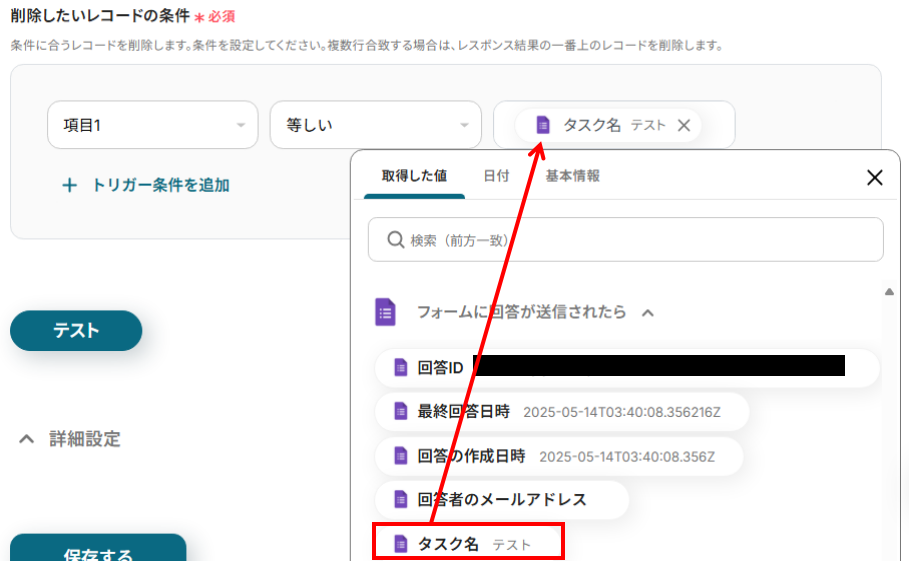 3.次に、先ほど設定したGoogle スプレッドシートのどのレコードを削除するか具体的に設定していきます。 「削除したいレコードの条件」には、レコードの削除条件を設定します。 入力欄をクリックすると、下記のようなアウトプットが表示されます。 今回は、Googleフォームのタスク名と同じレコードがあったら削除するよう設定しました。 条件の追加や変更が可能なので、お好みでカスタマイズしましょう! ※アウトプットについて詳しくはこちら をご覧ください。