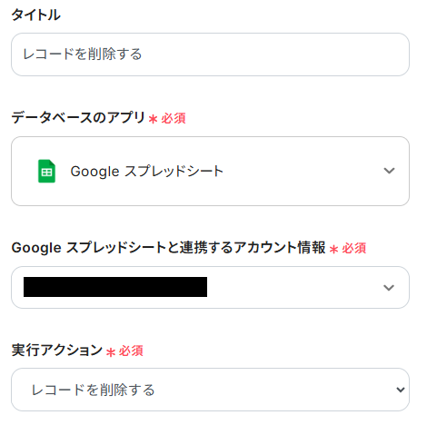 Google スプレッドシートの準備が整ったら、Yoom画面に戻りましょう。 タイトルとアカウント情報はステップ1で設定した内容が入力されています。 実行アクションは、テンプレート通りに「レコードを削除する」のままで大丈夫です。