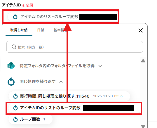 アイテムIDは「アイテムIDのリストのループ変数」を取得した値から入力します。