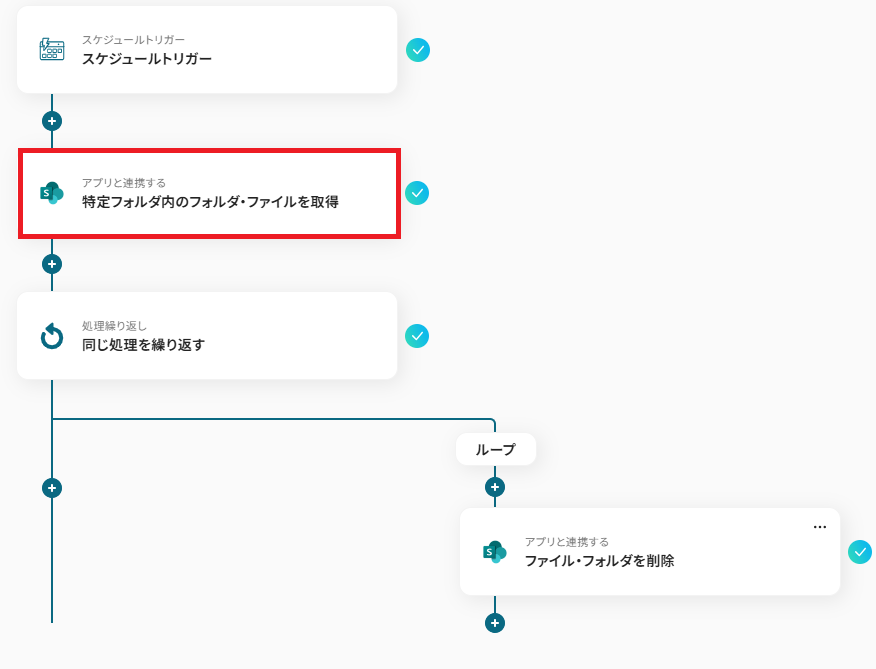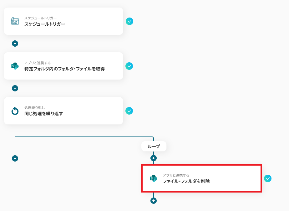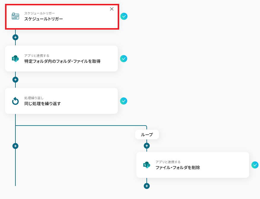 このワークフローを活用すれば、設定したスケジュールに基づいてMicrosoft SharePoint内の特定フォルダにあるファイルを自動で削除できるため、面倒なファイル管理業務から解放され、より安全で効率的な運用を実現します。