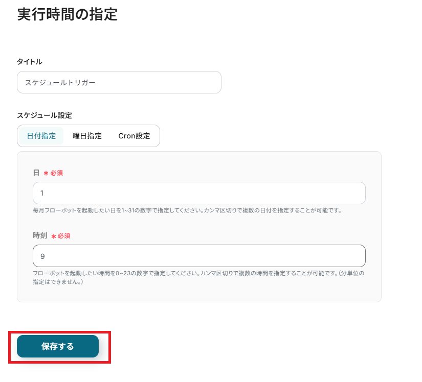今回は毎月1日の9時に削除フローが走るよう、以下のように設定しました。