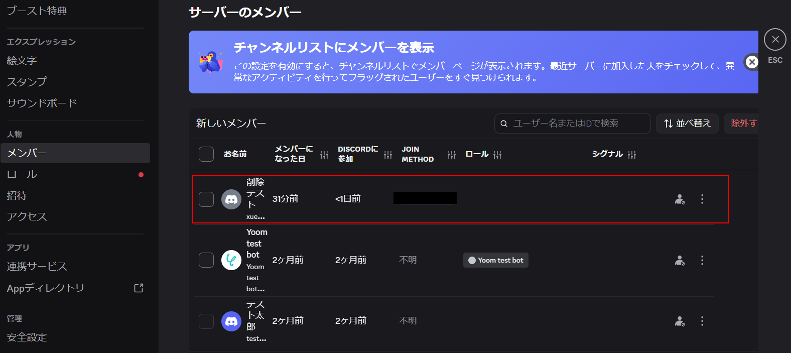 また、実際にDiscordのサーバーからユーザーが削除されていますので確認してください。