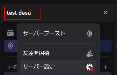 ユーザーIDをサーバーのメンバーから確認するには左上に表示されているサーバー名をクリックし、サーバー設定を選択します。