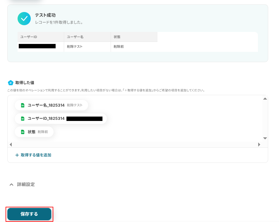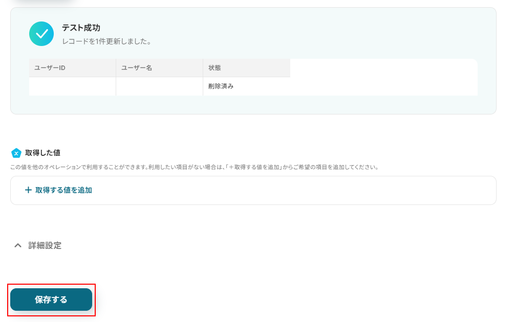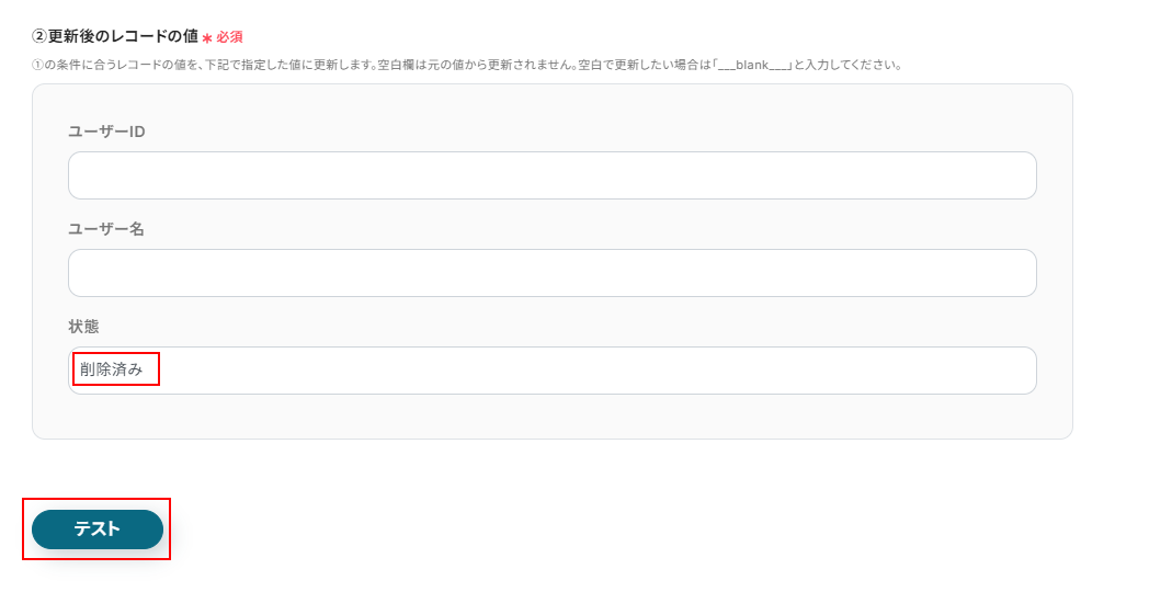 ※テストをクリックすると、実際にユーザーが削除されるため注意してください。