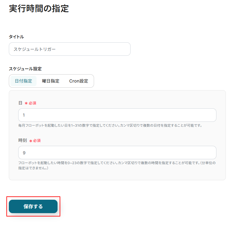 今回は以下のように、デフォルトで設定されている、毎月1日の9時からフローボットが起動するように設定しました。