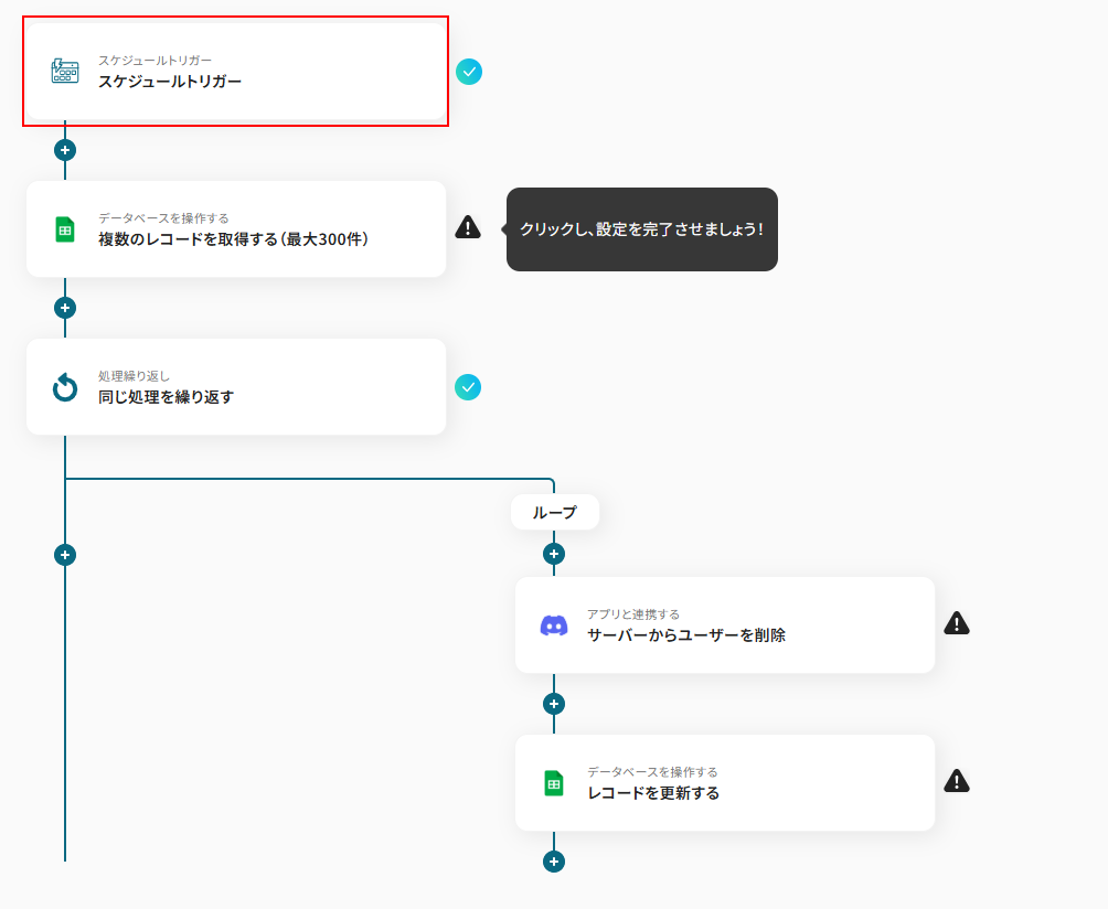 それではここから代表的な例として、指定した日時にGoogle スプレッドシートのリストに基づいてDiscordのユーザーを自動で削除し、結果をシートに記録するフローを解説していきます!